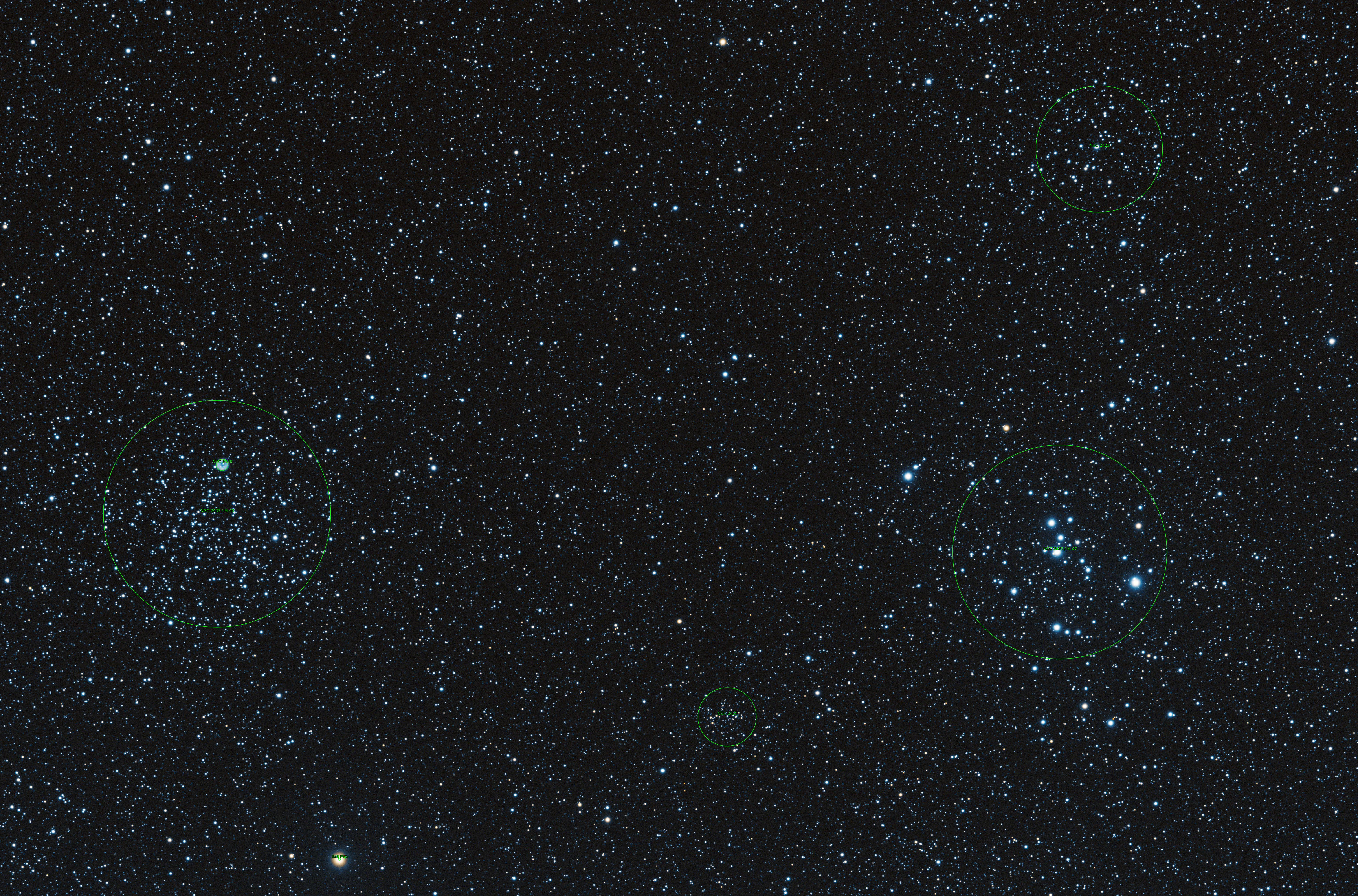 | Image Name: | M46 M47 NGC2423 NGC2425 NGC2438 | | Constellation: | Puppis | | Image Date: | 2026-03-18 | | Optics: | Astro-Tech AT115EDT Refractor | | Lenses: | Astro-Tech Flattener / Reducer 0.80 | | Camera: | ZWO ASI2600MM PRO IMX571 | | Focal Ratio: | F/5.60 | | Focal Length: | 640mm | | ArcSec/Pixel: | 1.21 | | Exposures: | RGB 3x180s | | Mount: | G11T | | Guided: | Yes | | Bortle Sky: | 3 | | Labeled Image: | Annotated View | | Posted by: | ozarkastro | | Views: | 20 |
