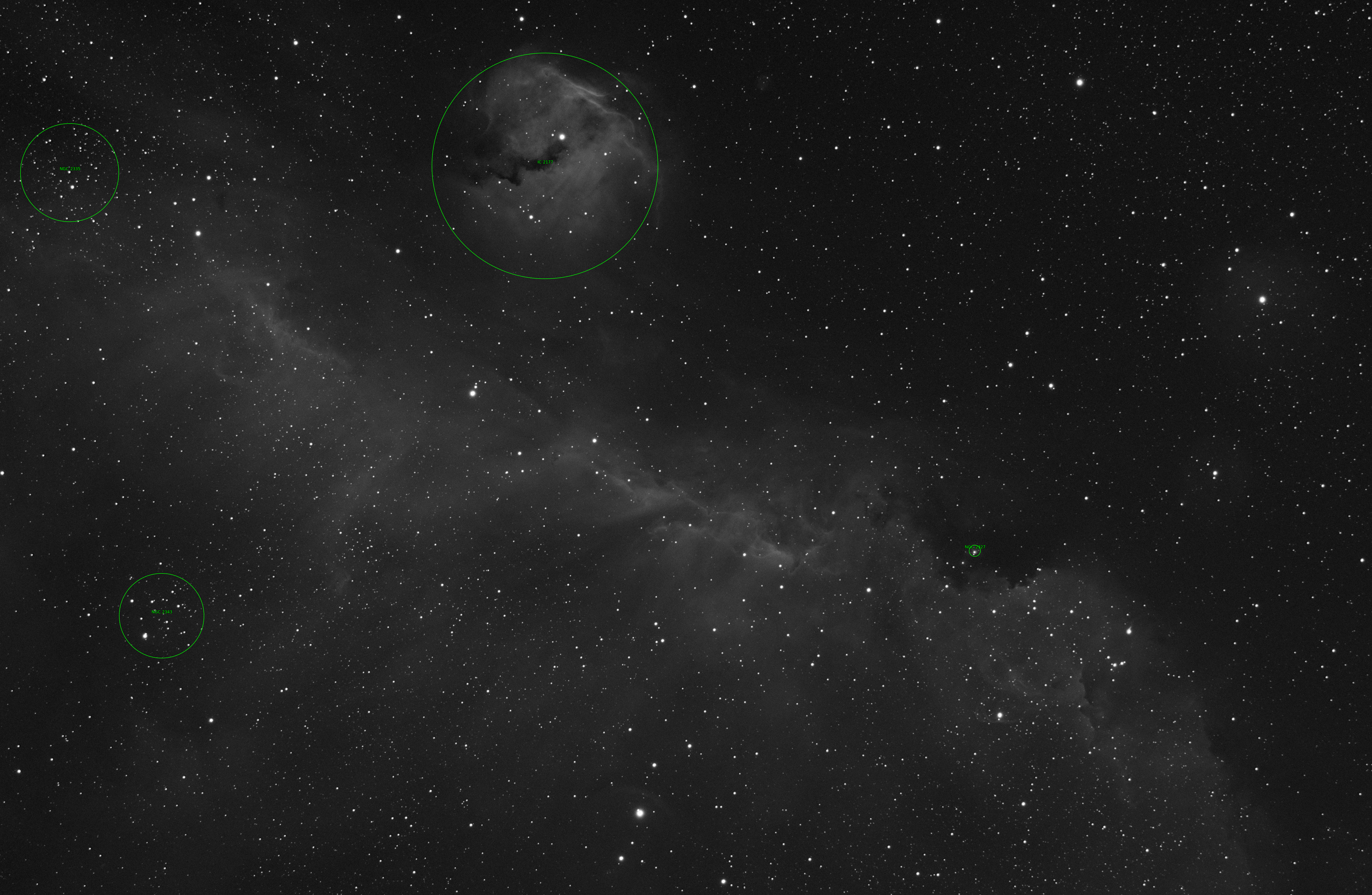 | Image Name: | Seagull Nebula IC2177 NGC2335 NGC2343n - HaR | | Constellation: | Canis Major | | Image Date: | 2026-03-20 | | Optics: | Astro-Tech AT115EDT Refractor | | Lenses: | Astro-Tech Flattener / Reducer 0.80 | | Camera: | ZWO ASI2600MM PRO IMX571 | | Focal Ratio: | F/5.60 | | Focal Length: | 648mm | | ArcSec/Pixel: | 1.20 | | Exposures: | Ha - 3x900s R - 3x300s | | Mount: | G11T | | Guided: | Yes | | Bortle Sky: | 3 | | Note: | Monoceros and Canis Major | | Labeled Image: | Annotated View | | Posted by: | ozarkastro | | Views: | 17 |